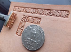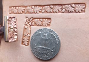 Razidlo do kůže s plastickým, motivem dubových listů o velikosti 18 x 8 mm. Jeden konec razidla navazuje na druhý a lze jím vytvářet různé linie.