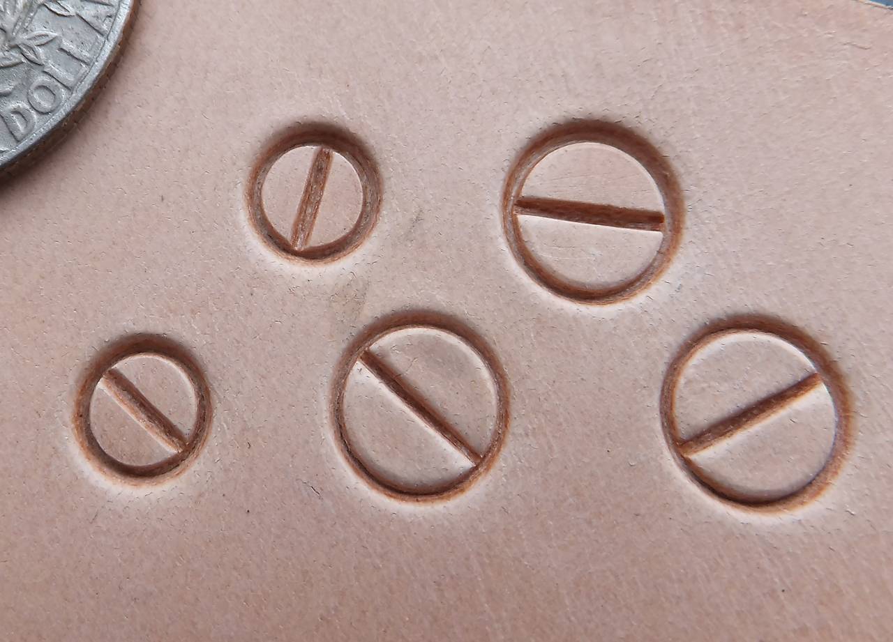 Šrouby 2 raznice do kůže – sada dvou razidel s motivem hlav šroubů o průměru otisku 6 a 8 mm. Pro Vaše tvoření z kůže. Razidla lze kombinovat s dalšími našimi motivy a vytvářet z nich řady např. na okraje sedel, kabelek nebo pásky na hodinky, opasky…
