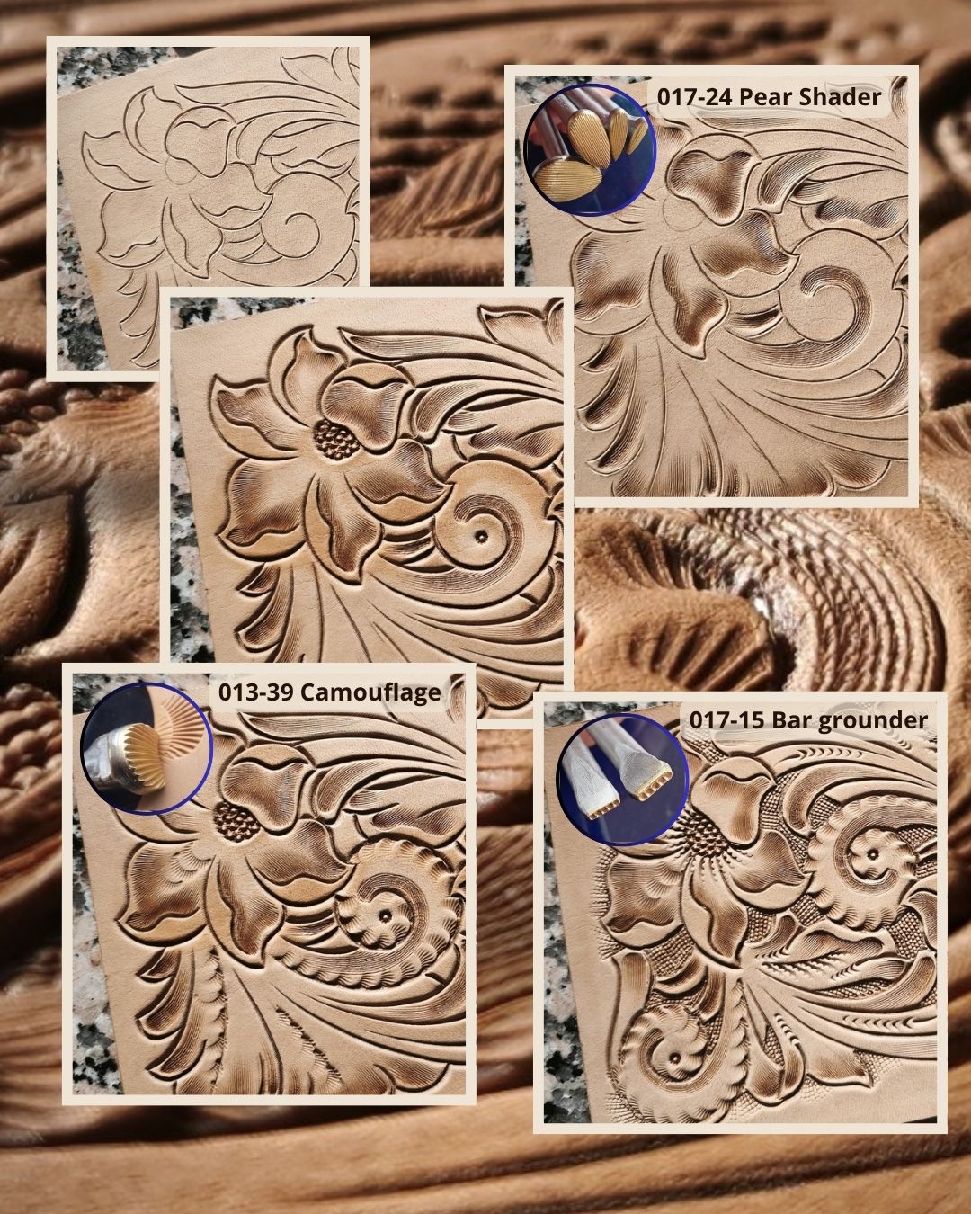 Matovací hrušky 4 Pear Shader set jsme vytvořili pro Arizona řezbu, viz foto, ale dají se použít na lístky jakýchkoliv jiných květů, pozadí a efektů dle Vaší fantazie. Na fotografii výrobku Milana Heitmara byly použity všechny velikosti. Kombinujte třeba s tímto vějířem Camouflage a vytvořte šneky jako na našich fotografiích.