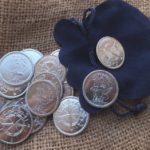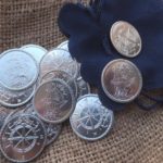 Mince zobrazují pirátskou plachetnici ve vlnách a směrovou růžici.