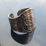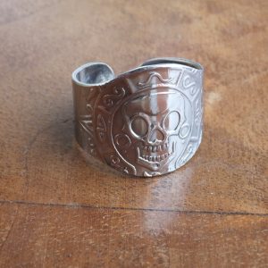 Prsten z leštěné nerezi s plasticky lisovanou lebkou z vlastní, autorské raznice. Průměr 20 mm – můžeme upravit na průměr prstu – při objednání uveďte, prosím, v poznámce. Výška motivu 19 mm.