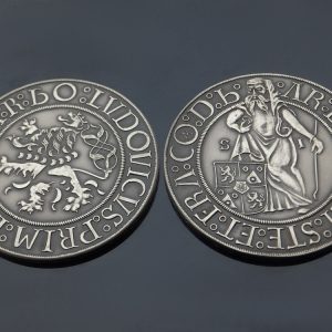 umělecká replika stříbrné české mince, ražená do alpaky s ruční patinou, která svou váhou i barvou dobře imituje starostříbro.