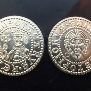 Umělecká replika unikátní české stříbrné mince, nalezené v izraelském městě Akkon, autorem je medailér Vojtěch Dařbujan.