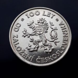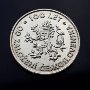 Dominantou přední strany je český dvouocasý lev se slovenským štítem na hrudi, inspirovaný mincemi první poloviny 20. století. Historický charakter doplňuje nápis „100 let od založení Československa“ ve stylizovaném písmu.