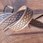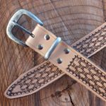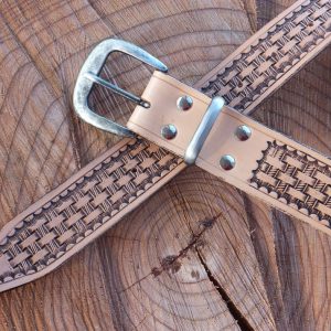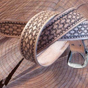 Extra dlouhý kožený opasek s hnědou patinou, zdobený razidlem, imitujícím propletený košík s lanem. Zadní strana je bez povrchové úpravy – přírodní kůže.