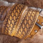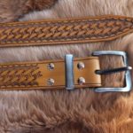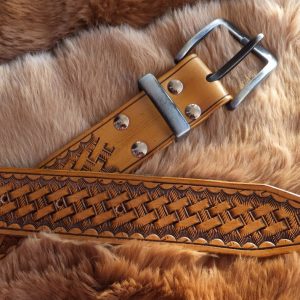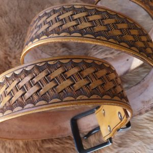 Světle hnědý kožený opasek s kontrastní patinou, zdobený razidlem, imitujícím propletený košík s lanem, razidlo je kladeno šikmo. Zadní strana je bez povrchové úpravy – přírodní kůže.