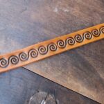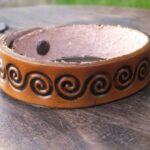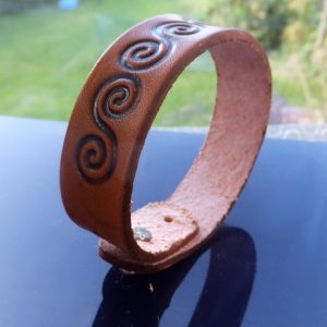 Kožený náramek s hnědou patinou, rozměru 240 x 18 x 2 mm se zapínáním (dá se vyšroubovat a posunout podle velikosti ruky).