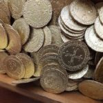 Papírové repliky zlaté mince z 15. století – ECU zlaté slunce francouzského krále Karla VIII. (1483 – 1498).