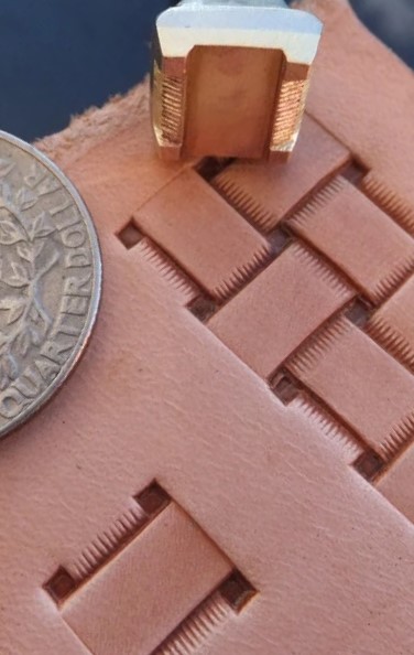Hranatý košík – řemínky, razidlo s nádherně plastickým motivem propletených řemínků 9,5 x 9,5 mm, který v návaznosti vytváří plochu podobnou pletenému koši ze širokých řemínků. Vytvořte si na své ploše kůže tento úžasně výrazný motiv. Kůži dobře předem provlhčete a nemusíte ji ani patinovat, kontrast vytvoříte pouhou ražbou.