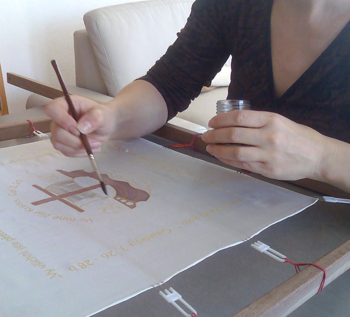 Maluji na bílý hedvábný šátek ze 100% hedvábí o rozměru 45 x 45 cm, který jsem ručně zaobroubila. Uprostřed křestní roušky je dominantní barevný motiv řeckých písmen, symbolizujících Krista jakožto počátek a konec všeho. Motiv vody je symbolem křestního pramene a nad křížem je holubice – symbol Ducha Svatého.