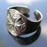 Ručně vyráběný prsten z leštěné nerezi, s výrazným, plastickým, rovnoramenným křížem. V nejširším místě má prsten 17 mm. Je roztahovací, dá se nastavit dle síly prstu. Dodáváme nastavení na vnitřní průměr 20 mm. Je možno jej však vyrobit menší, pro velmi tenký prst, nebo naopak mnohem větší (v případě potřeby uveďte při objednávce do poznámky nebo e-mailem).