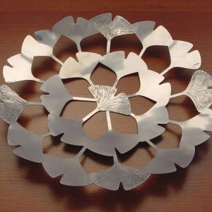 Vysoce dekorativní, prořezávaná nerezová mísa Gingo s motivy listů. Vyleštěná do vysokého lesku, některé listy jsou dekorované reliéfní ruční ražbou.