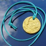 Keramická medaile pro malé piráty a pirátky s lisovaným motivem lebky a skřížených mečů, odstín aztécké zlato, zavěšená na tyrkysovém koženém řemínku. Průměr 33 mm, síla materiálu 2-3 mm.
