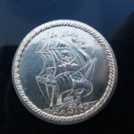 Pirátská mince s plachetnicí ve vlnách a světovou růžicí. Opatřeno autorskou a ryzostní značkou a státním puncem.