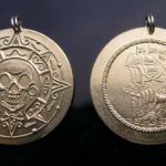 Přívěsek ve stylu Pirátů z Karibiku, ražený do masívní mosazi dle vlastního návrhu z ručně ryté raznice. Z druhé strany je vyražena pirátská plachtnice ve vlnách.