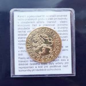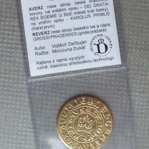 umělecká replika české mince, která byla ražena králem Karlem IV. Mince má na líci obraz české královské koruny a jméno panovníka, na rubu pak českého lva. Ražba je provedena do mosazi bez povrchové úpravy.