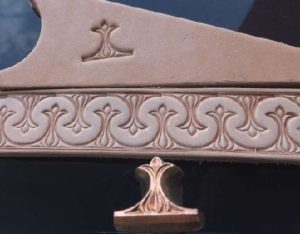 Razidlo s plastickým, rostlinným motivem v oblouku, který v návaznosti vytváří vlnovku s ornamentem.