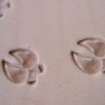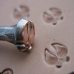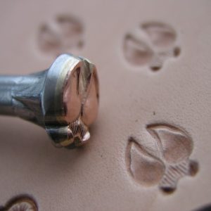 Plastické ruční razidlo s motivem jelení stopy (Jelenec běloocasý v běhu), zhotovené z mosazi a pevně spojené s ocelovým trnem.