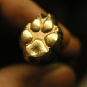 Plastické razidlo do kůže s motivem vlčí stopy o velikosti otisku 15 x 12 mm. Velikost celého nástroje je 100 x 16 x 14 mm. Mosazný reliéf je pevně spojen s ocelovým trnem. Využití pro práci s kůží, ale i na dekorování měkkých modelovacích hmot jako tvořítko.