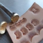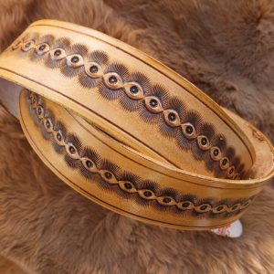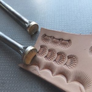 Sada dvou razidel do kůže s plastickými motivy, stylizovanými do vějíře, na jednom z nich je korunka.   Razidlem lze vytvářet různé linie, okraje i plochy a vzájemně je kombinovat. Aby ražba více vynikla, je možné kůži patinovat.
