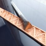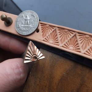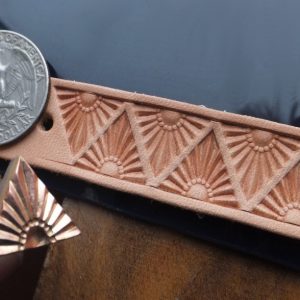 Razidlo do kůže s plastickým, motivem vycházejícího slunce, stylizovaného do trojúhelníku 15 x 15 mm. Razidlem lze vytvářet různé linie, okraje i plochy. Aby ražba více vynikla, je možné kůži patinovat.