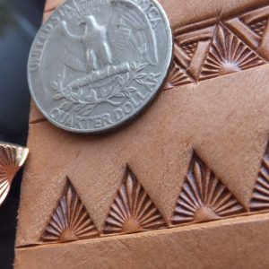 Razidlo do kůže s plastickým, motivem vycházejícího slunce, stylizovaného do trojúhelníku 9 x 9 mm. Razidlem lze vytvářet různé linie, okraje i plochy. Lze jej zajímavě kombinovat s vícero našimi razidly, viz foto.